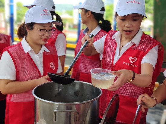 圖為志愿者合影 上午9點,志愿者們身著統一紅馬甲,在崗亭的安全島上設立服務臺,抬出食堂提前制作好的青草糊、綠豆湯等清涼飲品。你來分杯我來送,大家不亦樂乎開始了送清涼活動。