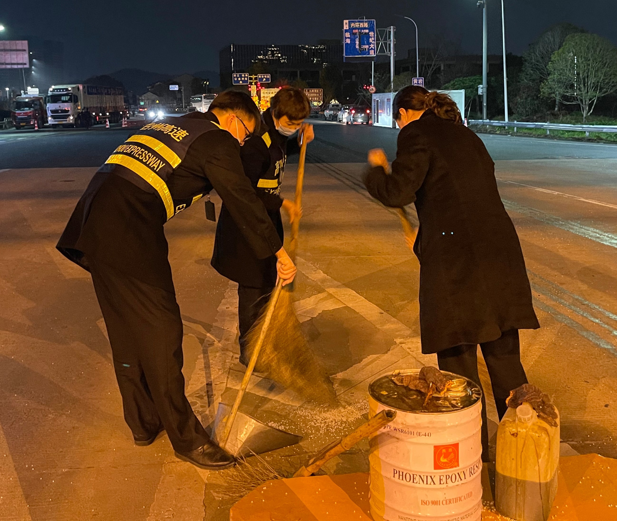 (圖為工作人員在清掃) 一時(shí)之間,車道路面上落滿大量的塑料顆粒,考慮到夜色已深,ETC車道上行駛的車輛速度大多很快,萬一司機(jī)沒有及時(shí)發(fā)現(xiàn)前方道路上的灑落物,極易造成輪胎打滑,嚴(yán)重影響行車安全。情況緊急,為了后續(xù)通行車輛的安全,收費(fèi)班長立刻關(guān)閉了該ETC車道,并放置警示標(biāo)志,然后將這一情況上報(bào)給監(jiān)控中心和收費(fèi)所值班人員。不等清潔人員到來,收費(fèi)員羅時(shí)杰從車道的工具房拿出掃帚和簸箕,主動開始清掃工作。隨后其他不坐崗的收費(fèi)員也投入到了清掃工作中,這支臨時(shí)清掃小隊(duì)在沒有任何人的領(lǐng)導(dǎo)下自發(fā)地組織起來。這時(shí),從高速上完成機(jī)電養(yǎng)護(hù)工作的機(jī)電班工作人員正巧路過,他們看到這一幕立刻將車停靠在一邊,加入清掃隊(duì)伍。盡管散落的塑料顆粒數(shù)量較多,但在大家的共同努力下,車道終于被清理干凈,恢復(fù)了正常通車。 春日的夜晚微風(fēng)拂過,已有春的暖意,而更暖的是這一幕在春夜里的一個個身影。大家因?yàn)橐患∈露墼谝黄穑欢踩珶o小事。所有人心系安全,為所有過往車輛保暢保安全,為臺州高速貢獻(xiàn)自己的一份力。 崔翔浩 吳侃霓