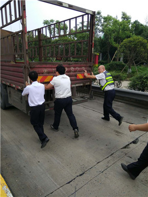 2018年5月27日,這本來是平凡普通的一天,可因?yàn)檫@件事,變成了不一樣的一天。 這一天,溫嶺西高速路收費(fèi)員洪燈杰像往常一樣,在一號超寬車道旁的收費(fèi)亭里工作。一輛綠色汽車剛走不久,卻發(fā)現(xiàn)后面一輛12軸型的小貨車停在那里,一動(dòng)不動(dòng)。洪燈杰心生疑惑,于是趕緊走出收費(fèi)亭,到小貨車跟前查看。原來,這輛車剛走到收費(fèi)站面前,便耗盡了電量,發(fā)動(dòng)不了了。正在司機(jī)焦頭爛額之時(shí),班長湯明漲和其他收費(fèi)員吃飯回來,看見了這一幕。 湯明漲簡單地詢問了洪燈杰事情的經(jīng)過,本來準(zhǔn)備等拖車,可是現(xiàn)在正是中午車輛高峰期,加上五號車道在施工,等拖車不合適。如果導(dǎo)致一號車道堵車,切換成ETC也緩解不了。考慮到這些問題之后,湯班長決定叫來幾個(gè)“大力士”,幫忙推車。