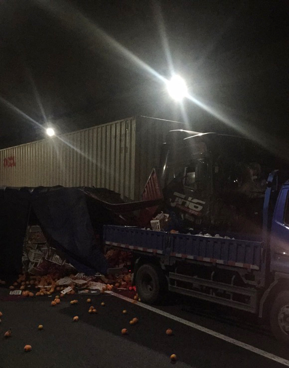 圖為事故現(xiàn)場(chǎng) 得知此情況,所負(fù)責(zé)人第一時(shí)間趕赴事故現(xiàn)場(chǎng)。事故就是命令!救援隊(duì)伍立即兵分三組,一組由駕駛員林通用巡邏車送傷者至臺(tái)州收費(fèi)所出口,與前來(lái)救援的120救護(hù)車進(jìn)行對(duì)接,一組由金志輝、宋勤滿在寧向南洞口卡口,一組由李海福所長(zhǎng)、應(yīng)錦清副所長(zhǎng)在現(xiàn)場(chǎng)協(xié)調(diào)指揮,同時(shí)配合交警維護(hù)通行秩序,與交警一起對(duì)事故現(xiàn)場(chǎng)展開救援。 經(jīng)了解,由于藍(lán)色貨車超車道緩慢行駛,集裝箱與貨車發(fā)生車輛剮蹭追尾導(dǎo)致后方送桔貨車側(cè)翻。貨車上的桔子多半散落,給清障帶來(lái)一定的難度,管理所負(fù)責(zé)人、高速交警、清障人員、養(yǎng)護(hù)人員共同當(dāng)起了“指揮員”、“搬運(yùn)工”,全力清理事故現(xiàn)場(chǎng)。 16時(shí)36分,由于處理及時(shí),措施得當(dāng),事故未造成大面積擁堵,道路恢復(fù)正常通行。 林玲