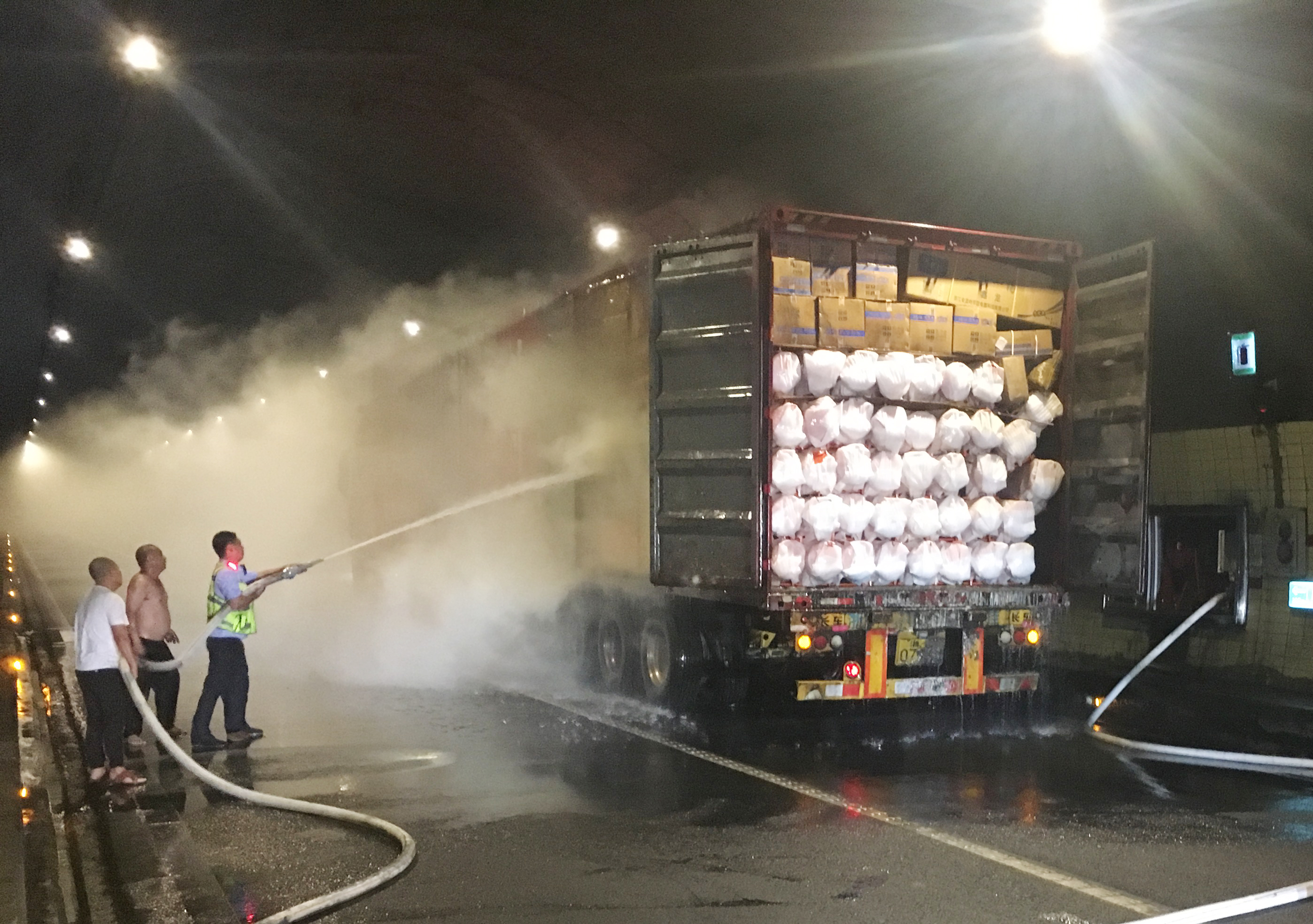 圖為滅火現場 萬幸的是,恰逢溫州高速交警巡邏車經過,隨即在該貨車后方預警,很快的所巡邏車、消防車先后到達現場協同滅火。由于該車貨物較多,且裝載物皆為紙箱和塑料,集裝箱底層溫度較高,一時只能將明火撲滅,但車廂內仍有大量煙霧,為了安全,車子必須盡快撤離隧道,執勤隊當即決定讓駕駛員把車開往南廣場繼續滅火,消防車則一路緊隨其后滅火,以防火勢變大。 05:02分,大貨車終于開至南廣場,消防隊員對車上的貨物進行清理,才徹底將此次火災撲滅,隧道恢復安全行車。
