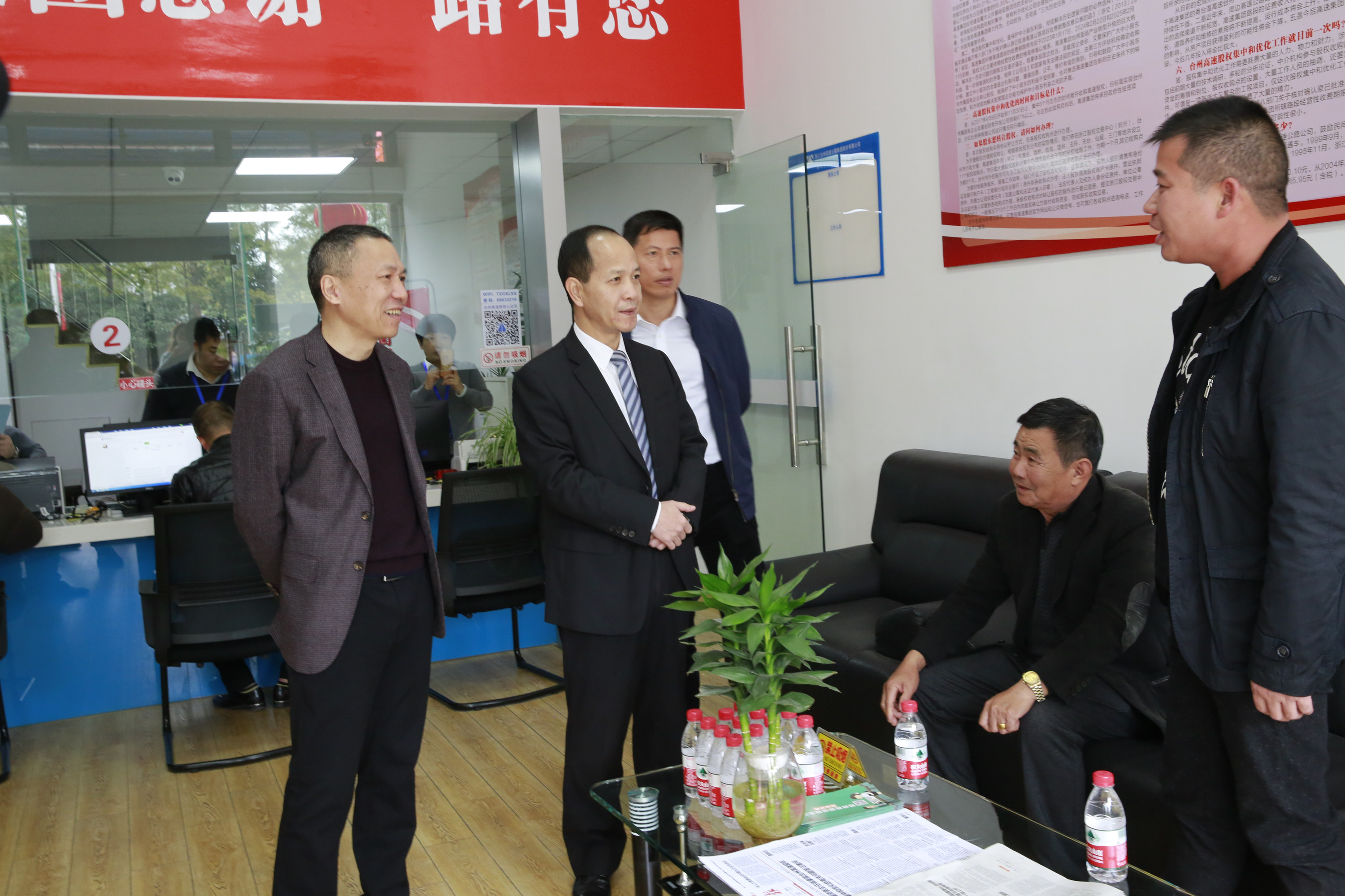 11月28日上午,副市長張加波到臺州高速股權椒江收購點調研股權集中收購工作。臺州高速集團領導班子成員、椒江區常務副區長王智承等陪同。