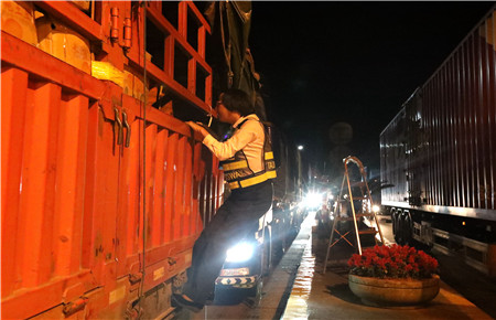夜間綠農車輛多,據統計,當天凌晨早班臨海南收費所出口綠農車108輛,是平時日均數量的八九倍。短時間內的“井噴式”增長,這又是一個大考驗。“三號綠色”、“一號綠色”、“二號綠色”……“來啦!”旁站人員箭步沖過去拍照取證、檢查車輛。大貨車又高又寬,平時需登專用扶梯進行檢查,可在大流量面前保安全省時間是第一要旨,這些個巾幗女將們面對高貨車,一手拉著車把,一腳踩在車杠上,迅速上車開展核查,執行速度絲毫不遜于男同志。有時剛從這輛貨車上下來,又立刻奔向了其它車道。晴夜當空,車道間一個個忙碌的身影不停穿梭著,卻不言乏力。