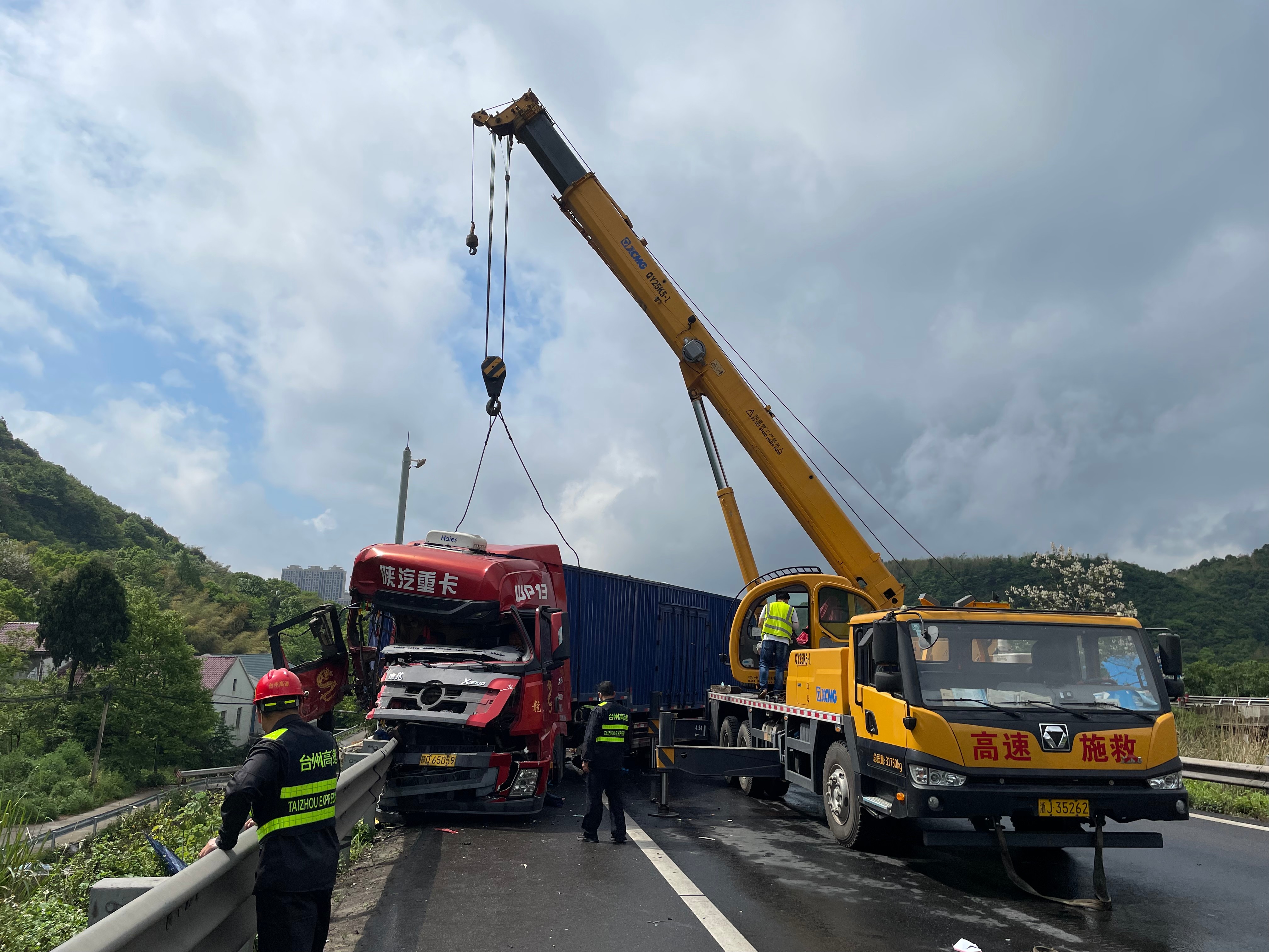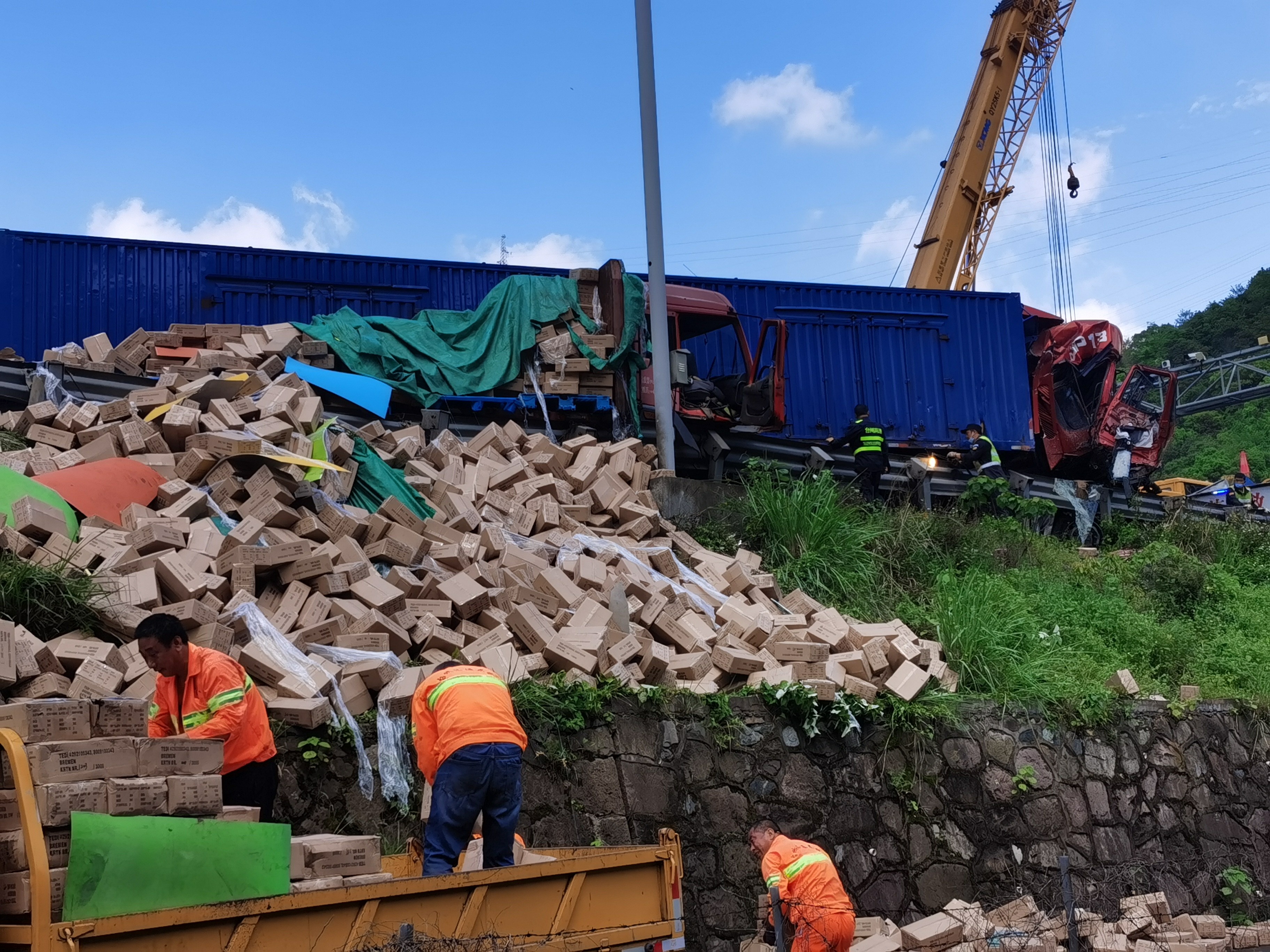 聽到巨響的黃土嶺隧道所工作人員立刻提高警惕,啟動應急預案,所負責人應錦清帶領執勤隊員迅速出動到達事故現場,執勤隊員第一時間在事故車后方預警,以防二次事故。因大貨車車身橫在路面,可通行的道路僅留2米多寬,周圍一下子便開始擁堵。執勤隊、施救人員聯合高速交警指揮交通,讓后方無法通行的貨車暫時排在一側,保證后續救援暢通。