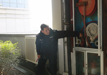 圖為安保部負(fù)責(zé)人在檢查滅火器