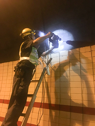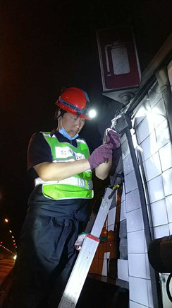 圖為工作人員安裝消防燈燈泡 大溪嶺—湖霧嶺隧道全長4116米,為保障隧道內行車安全、暢通、舒適,定期組織安排清洗隧道兩壁墻體、邊溝,檢修內部各項機電設施成了維養中心每季必不可少的工作之一。而每次清洗檢修必將涉及封道,為最大程度減少因封道對社會造成的負面影響,中心工作人員早在一周前就對隧道內各項損壞機電設備進行摸底統計,以便合理制定維修方案和安排施工人員。 12號早上7點,隨著封道工作就緒,兩組清洗隊伍分別從隧道中部開始向兩頭清洗,六組專業燈具維修人員站在貨車腳手架上由北往南逐個推進,發現一盞修復一盞,或更換燈管、或更換觸發器、或更換鎮流器,對于一些同時有多個配件壞死或腐蝕嚴重的燈具就直接采取整體更換措施,大大提高了工作效率。而中心工作人員除了現場全程協調管理以外,還負責修復隧道兩壁逃生標志及報警電話等多個指示牌。按照之前制定的計劃,六人兵分兩組由隧道兩頭分別向中間修復,這樣既能與其他工作同時進行又不造成相互干擾。另外一人則配合隧道所一起在登高車協助下,對洞內各類攝像頭進行逐個清理,全場人員各司其職,各盡其責,現場一派忙碌的景象。 4公里多長的隧道,由于流動性差,洞內空氣質量比霧霾嚴重數倍,僅一只口罩根本凈化不了廢氣,但由于時間緊,任務重,中心隊員和施工人員顧不上惡劣的環境,努力和時間賽跑,兩日下來共修復(清理)損壞燈具100余套,各類標志指示牌40余塊,攝像頭30余個,恢復了隧道內各項機電設施的正常運行,排除一切安全隱患,有效保證了隧道安全暢通。 項寅曉