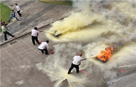 “趕快救火!”隨著教官一聲令響,比武正式開始。“消防員”們個個行動神速,鎮定地手持滅火器,拔掉保險銷,對準著火點壓下手把噴射,動作連貫一氣呵成。