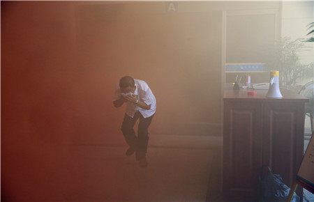 “消防演練現在開始”隨著現場總指揮項同富的一聲令下,在刺耳的警笛聲和濃煙中,天和大廈全體人員在樓層疏散引導員的指引下迅速向一樓撤離。 這是6月26日臺州高速集團聯合多家單位組織的天和大廈大樓消防疏散演練的重頭戲。火災模擬的著火點在大廈20樓,在災情發生后,微型消防站消防隊員身穿防護服,攜帶消防設備在20樓處置模擬火情。同時消控室發動應急廣播,通報火情,下達全大樓疏散指令。各樓層疏散引導員立即組織本樓層人員以濕毛巾捂住口鼻,彎腰低頭從消防樓梯魚貫而出向下撤離。
