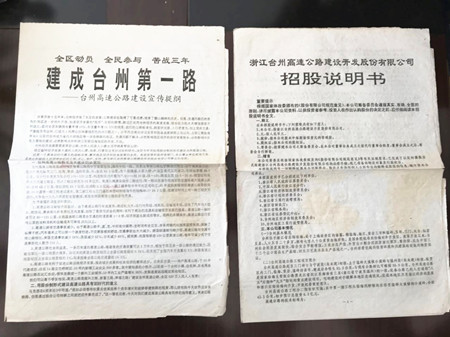 辦理業務的過程中,有個股東說:“臺州高速真是貼心,知道我們跑城里不方便,還上門辦理業務,就沖這個也要來把股票賣掉。”還有個股東說:“臺州高速真好,我只投了200塊錢,除了給我一千多的分紅,現在216股還能賣1500多,非常合算,早知道買一萬股了。” 臨近中午的時候,來了一位面目普通的中年人,他準備了他父親和母親的身份證還有銀行卡,工作人員以為是兩筆代辦業務,原來是查詢股東紀錄的,查詢的股東名字叫婁巖奶,因為巖奶兩字比較少見,我記得上午的時候辦理過一個叫巖奶的股東的收購業務,就非常好奇的詢問,這時候管理處的工作人員解釋,他們這里有兩個叫巖奶的人,一個是婁巖奶,一個是宋巖奶,經過查詢卻沒有找到婁巖奶的股東信息。據管理處工作人員回憶,1993年婁巖奶當時還未退休,應該購買了股票。經過查詢管理處的退休人員清冊,發現婁巖奶于1994年12月才退休,根據初步判斷估計該股東可能當時出于各種原因并沒有購買股票。為了慎重起見,于是工作人員請求管理處把股票購買的原始檔案調閱出來查看,翻開斑駁的原始記錄,一個一個仔細查詢股東姓名,但是很遺憾并沒有該股東的信息,工作人員肯定地回復了股東。雖然讓婁巖奶的兒子失望了,但是工作人員卻在斑駁的檔案中看到了非常珍貴的歷史檔案:《全區動員、全民參與、苦戰三年、建成臺州第一路—臺州高速公路建設宣傳提綱》、《浙江臺州高速公路建設開發股份有限公司招股說明書》,看著這些檔案,眼睛有些濕潤,仿佛又回到了那個波瀾壯闊的年代,也為高速集團曾經的創舉而驕傲。