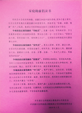 為充分發(fā)揮員工家庭成員在黨風(fēng)廉政建設(shè)中監(jiān)督預(yù)防的特殊作用,根據(jù)集團“廉政教育月”活動要求,5月30日,監(jiān)察室向全體員工發(fā)放了一封以“傳承好家風(fēng),共建廉之家”為內(nèi)容的《家庭助廉倡議書》,讓廉潔文化走進家庭,成為家庭美德,更好地發(fā)揮家庭成員在廉政建設(shè)中的特色作用。