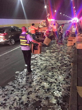 這輛“始作俑者”的車輛由于司機疲勞駕駛,不慎撞擊隧道壁而引發側翻,雖然該車內無人員受傷,可是跟隨其后的拖掛車就沒那么幸運。拖掛車司機看到前方出狀況,當即采取緊急制動,剎得太急又致使后方小貨車追尾,導致該車車頭嚴重受損,司機的手臂受了傷,運輸的鋁塊也撒了一地。