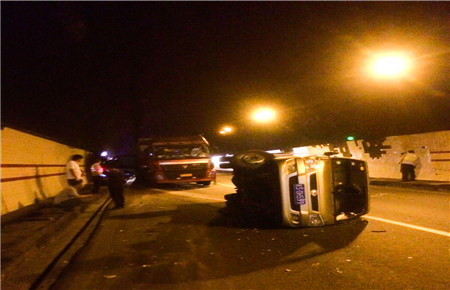 兩起事故的接連發生使救援工作緊張。2分鐘后,執勤隊火速趕到了事故現場,為了以最短時間恢復正常通行,隊長謝永濱決定兵分兩組,一組自己帶隊對第二起事故立即進行處理,讓輕微擦傷的三輛事故車先撤離現場,在下個出口等待交警處置,并向監控中心通知需拖車前來施救,與此同時加強預警,快速疏導交通。另一組由執勤隊員跑步前進查看事故現場,了解車輛情況。經查看,該貨車因爆胎導致撞車,所幸側翻事故未造成人員傷亡。在各部門的通力配合下,一個小時后,事故現場清理完畢,隧道恢復了正常通行。