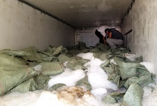 李貴陽打開車輛后廂門,迎面撲來一陣冷風,一眼望去車廂里面全部是一袋袋的花蛤,上面還壓著袋裝的冰塊和零碎的碎冰,車廂內部看不清楚。憑借多年的工作經驗和認真負責的工作態度,李貴陽二話沒說,直接爬上濕滑的車廂,踏過冰袋和碎冰,深入到車廂里面去檢查,把冰袋掀開后,結果發現下面全部是空桶。原來這樣做既可以增加貨物面積也可以使重量加重,從而達到綠農政策的免費通行要求。