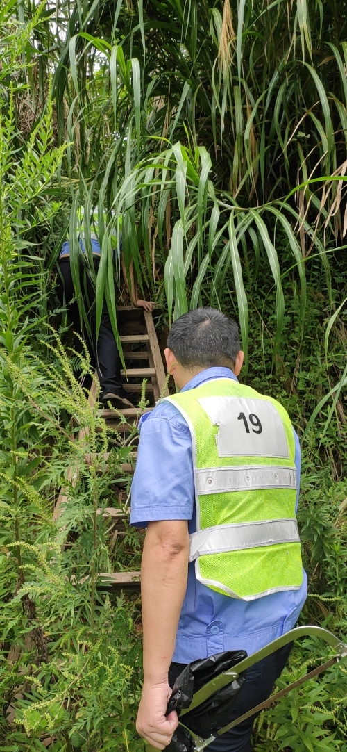 9月23日早上8點45分,中控員發現大溪嶺隧道北高位水池圖像模糊,照明燈不亮了。 為保障隧道消防安全,中控員對消防水池的水位需時時關注,萬一水池漏水無法及時查看,如遇火災,消防水供應不上,后果不堪設想。隊長意識到事情的嚴重性,即刻安排電工湯寧光和陳幸趕往北面山上的高位水池位置。初秋的山上植物茂盛,原來通往水池的小路早已淹沒在雜草間,隊員們提著工具,憑著記憶找小路,單手撥開雜草往山上走,到達高位水池之后,他們分工協作,一邊檢查線路,一邊抬開井蓋并下到水池檢查照明燈,經過檢查后發現只是線路有點松動,陳幸馬上對線路進行加固。