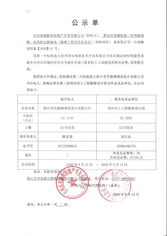 黃巖二環西路西側、儀風街北側地塊(勘察工程及外業見證)中標公示