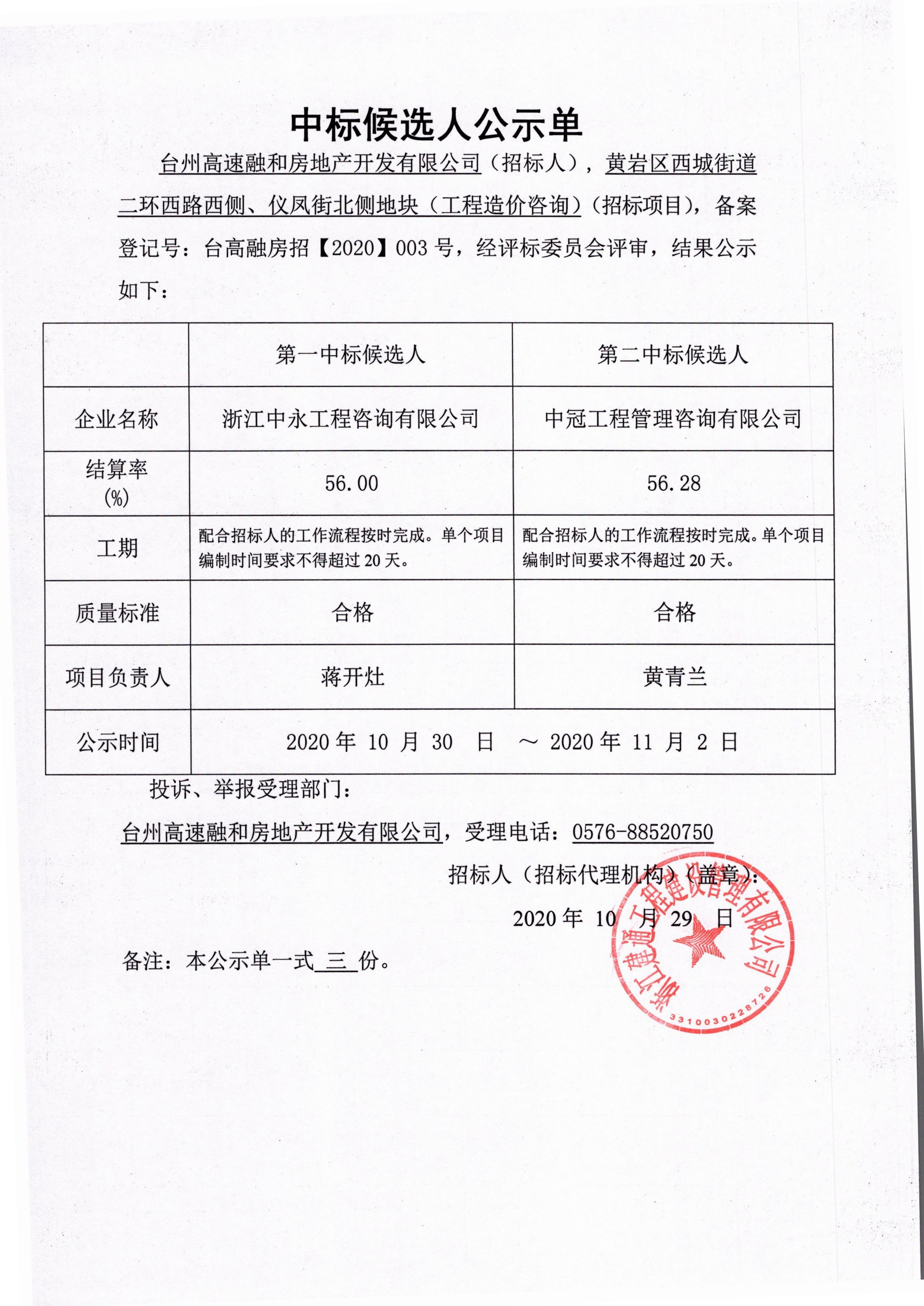 黃巖區(qū)西城街道二環(huán)西路西側(cè)、儀鳳街北側(cè)地塊(工程造價(jià)咨詢)中標(biāo)候選人公示單