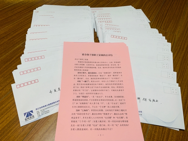 集團(tuán)開展致全體干部職工家屬的公開信活動(dòng) 6月18日,集團(tuán)緊貼廉政教育月活動(dòng)要求,將“致全體干部職工家屬的公開信”交到每一名職工手中,以這種家書形式廣泛宣傳廉潔清正的重要性,呼吁他們爭當(dāng)反腐倡廉的“廉內(nèi)助”。