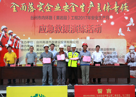 集團(tuán)總工程師江輝,安全總監(jiān)項(xiàng)同富,騰達(dá)建設(shè)集團(tuán)總經(jīng)理?xiàng)罹湃绯鱿顒?dòng),黃巖東區(qū)、南區(qū)建設(shè)指揮部相關(guān)人員,內(nèi)環(huán)路(黃巖段)工程施工單位項(xiàng)目領(lǐng)導(dǎo)、專職安全員,市政公司全體員工參加活動(dòng)。